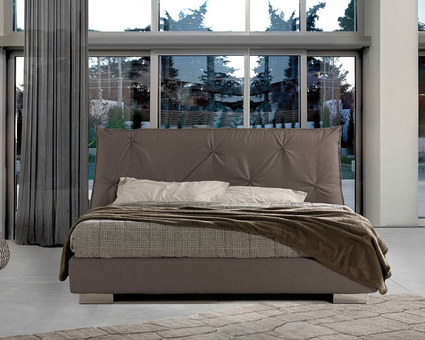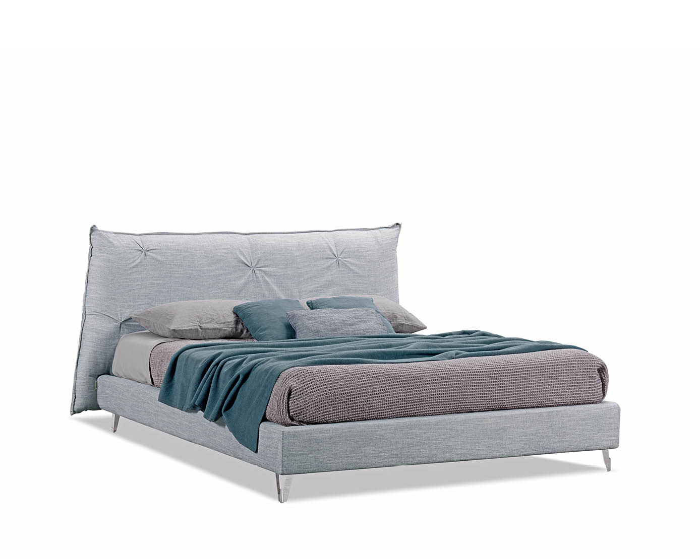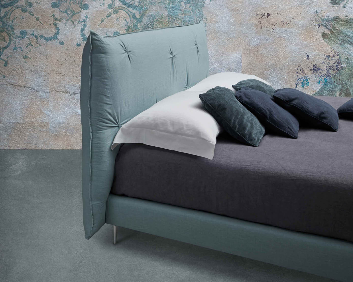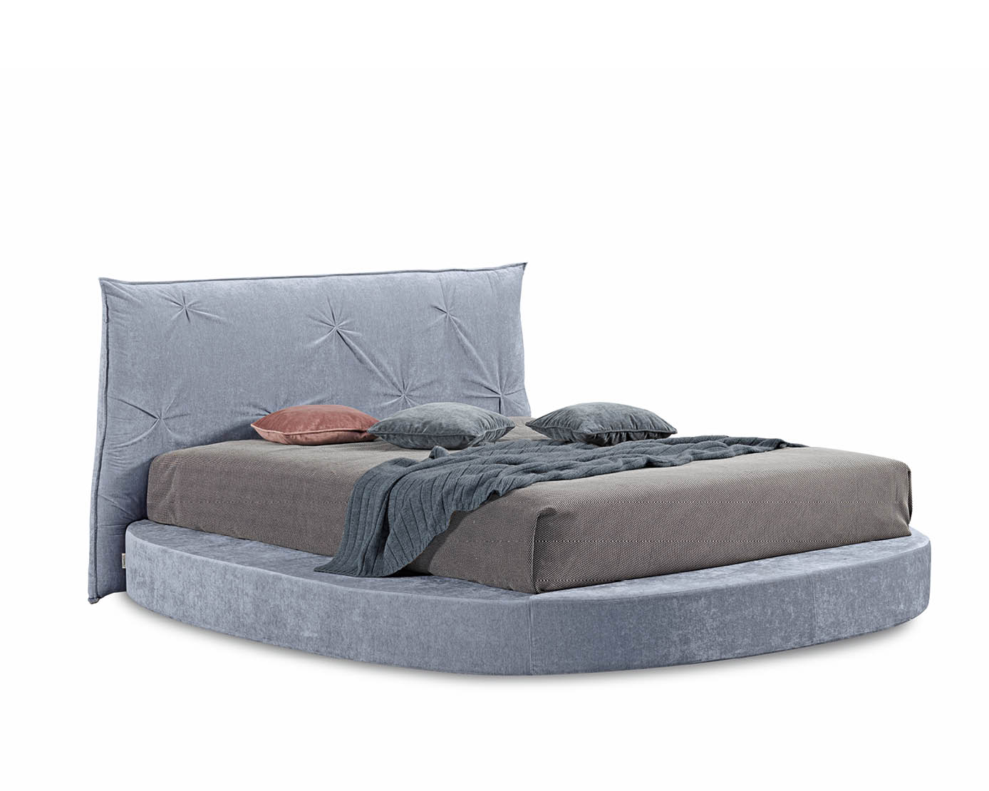 La testata del letto Vittoria è caratterizzata da una cucitura a vista sui bordi e una particolare lavorazione “a stella” centrale.