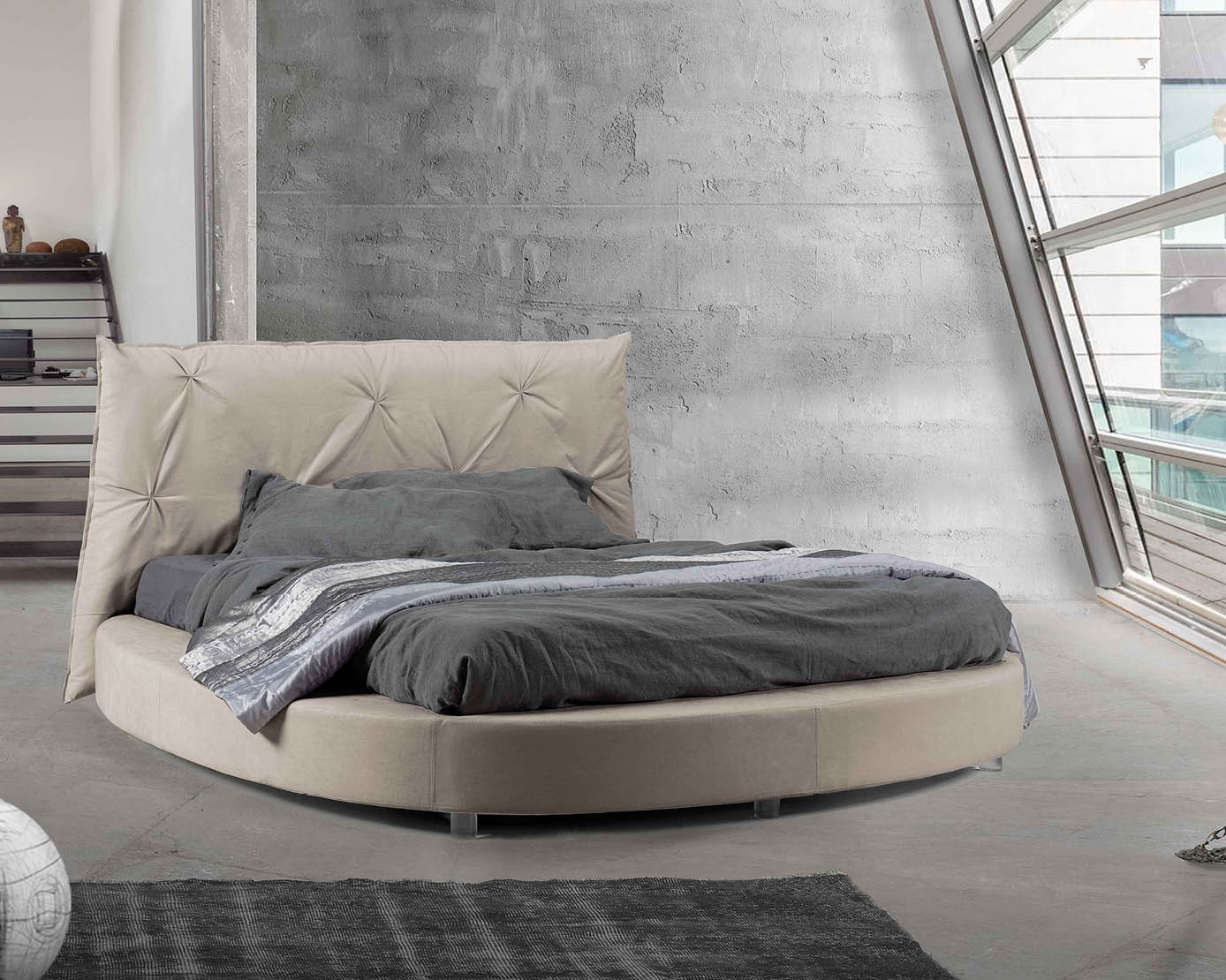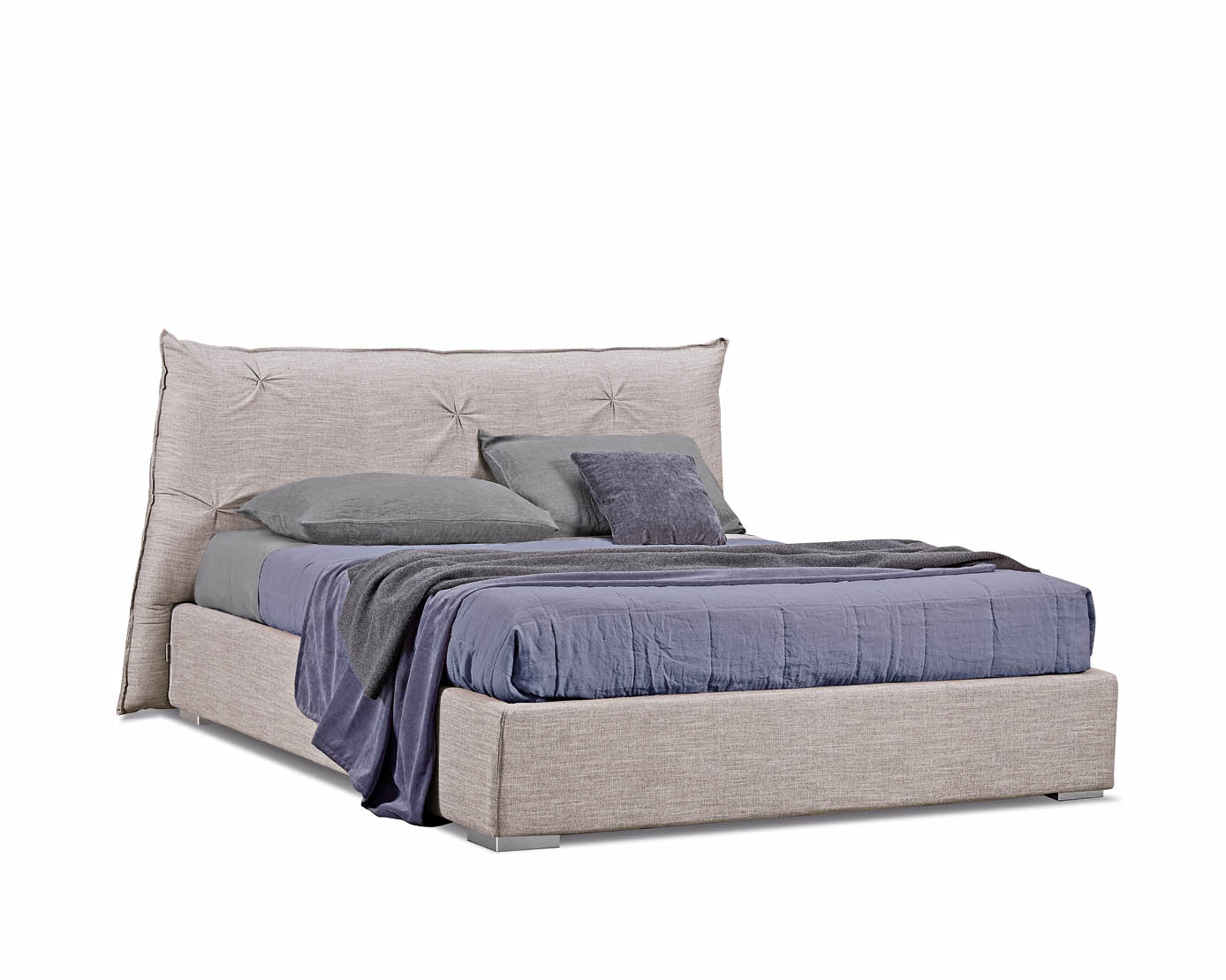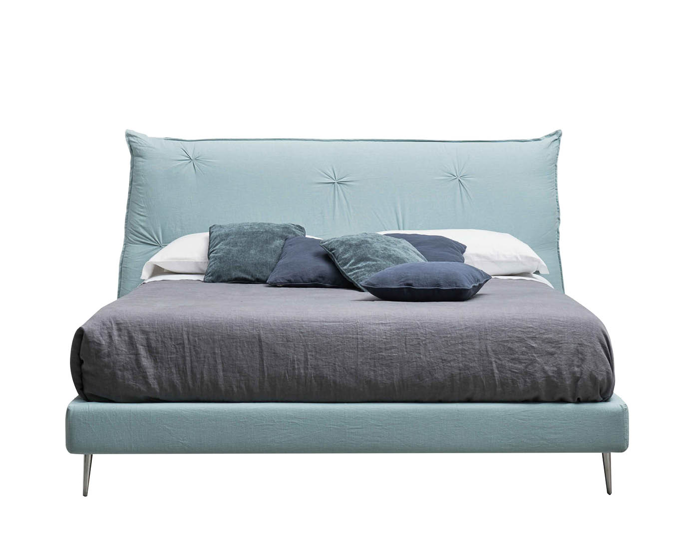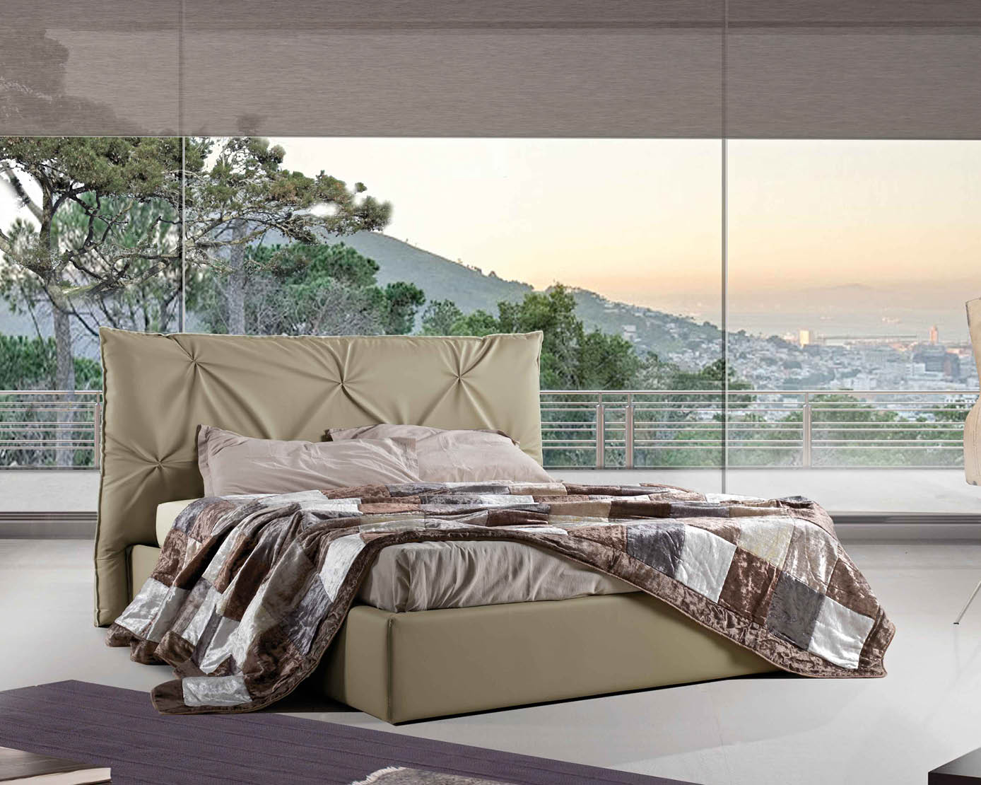 La testata del letto Vittoria è caratterizzata da una cucitura a vista sui bordi e una particolare lavorazione “a stella” centrale.
