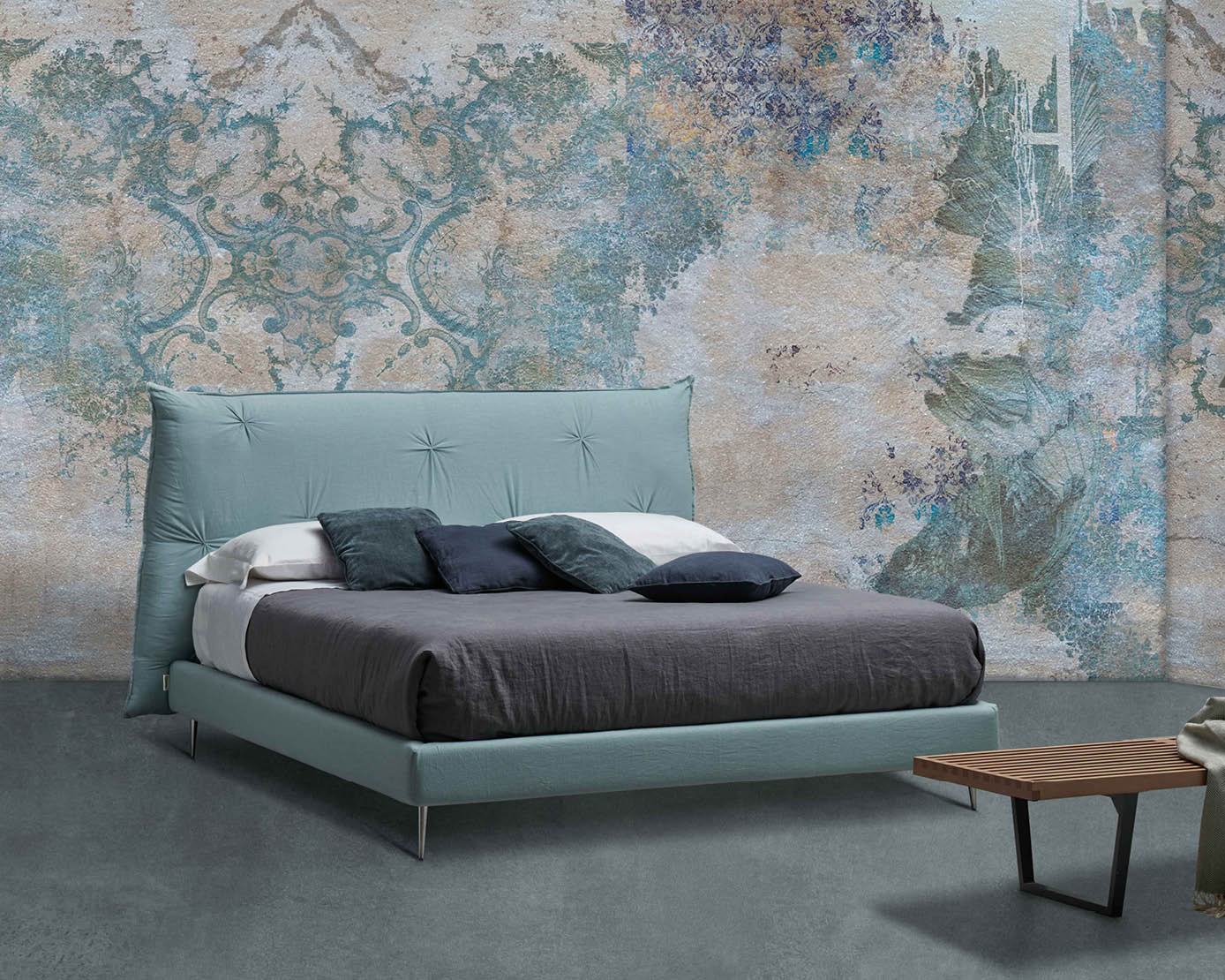 Splendido esempio di fusion tra oggetto d’arredo e moda. L’importante testiera è messa ancora più in evidenza dalle preziose cuciture a vista modello taglia e cuci.
